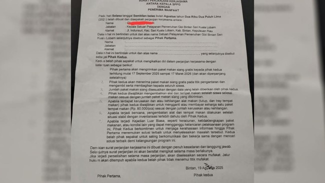 Sebelumnya, foto berisi surat perjanjian serupa yang bertuliskan dari Satuan Pelayanan Pemenuhan Gizi (SPPG) di Kalasan, Sleman, DI Yogyakarta, juga sempat viral di media sosial.